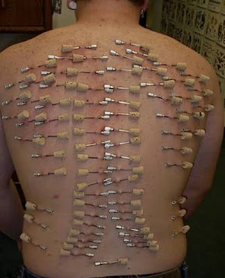 Brent Moffatt dari Winnipeg, Kanada, ditusuk dengan jarum bedah sendiri untuk menciptakan rekor Guinness untuk tindikan tubuh yang paling, di Montreal, 13 Desember 2003. Moffatt dimasukkan 900 jarum ke kakinya untuk memecahkan rekor sebelumnya 702 tindikan.